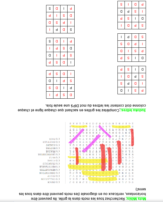 Sudoku lettres: Complétez les grilles en sachant que chaque ligne et chaque colonne doit contenir les lettres du mot DIPS une seule fois.